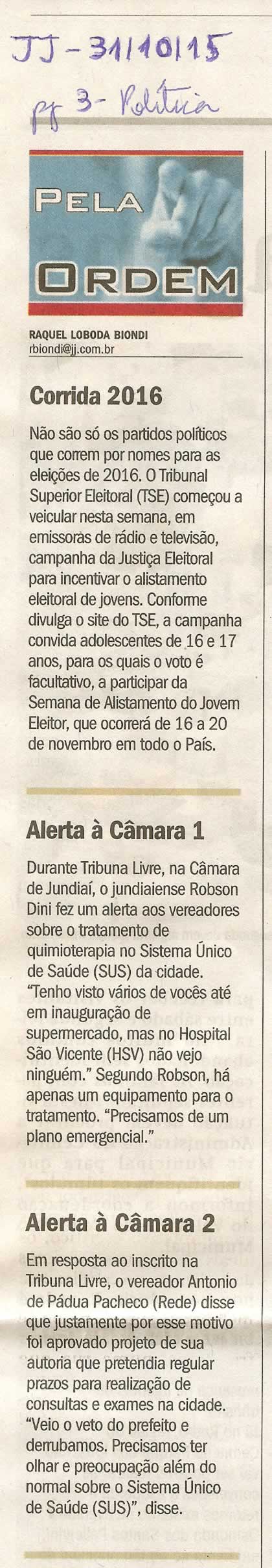 JJ - 31/10/15 - pg 3 - política - pela ordem - | câmara municipal de jundiaí, tribuna livre, são vicente, SUS, dr pacheco, quimioterapia |